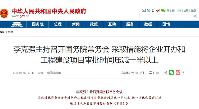 国务院5月2日主持召开国务院常务会议,采取措施将企业开办时间和工程建设项目审批时间压减一半以上,进一步优化营商环境;通过《人力资源市场暂行条例(草案)》。